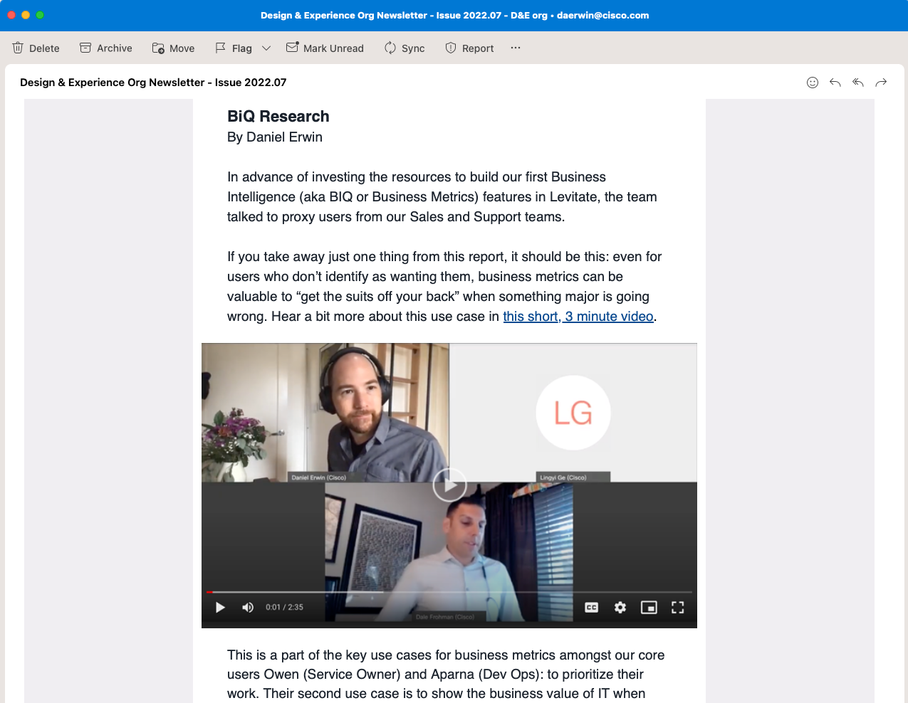 A key part of the design process is to frequently take time to connect with users to get a deeper understanding of their processes and concerns, as well as to validate that a solution I've put together makes sense to them the first time they see it. I framed the research pictured here to set a solid foundation for the Business Insights product, which deserved the investment of our time to understand deeply since it is "the tip of the spear" in opening up sales conversations with the highest-level stakeholders at customer organizations.