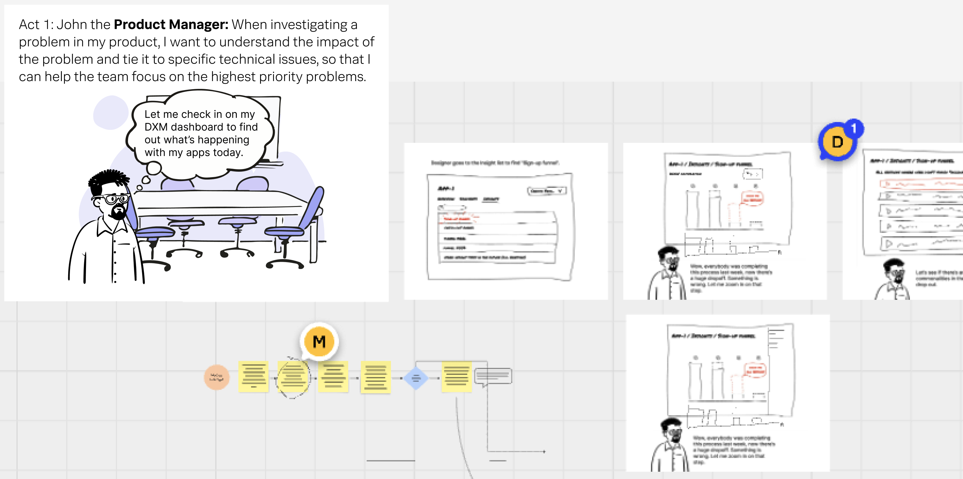 At the same time, I also lead UX Design for the Digital Experience Monitoring program, I was responsible for helping the design team understand how users would get use multiple areas of the product to achieve higher-value usecases than they could from any one area alone. Here's a sample of the beginning stages of one scenario I used to help the team get on the same page about the user's goals and ultimate value, and to drive a conversation about the long-term priorities and agenda with Product Management and Engineering partners.